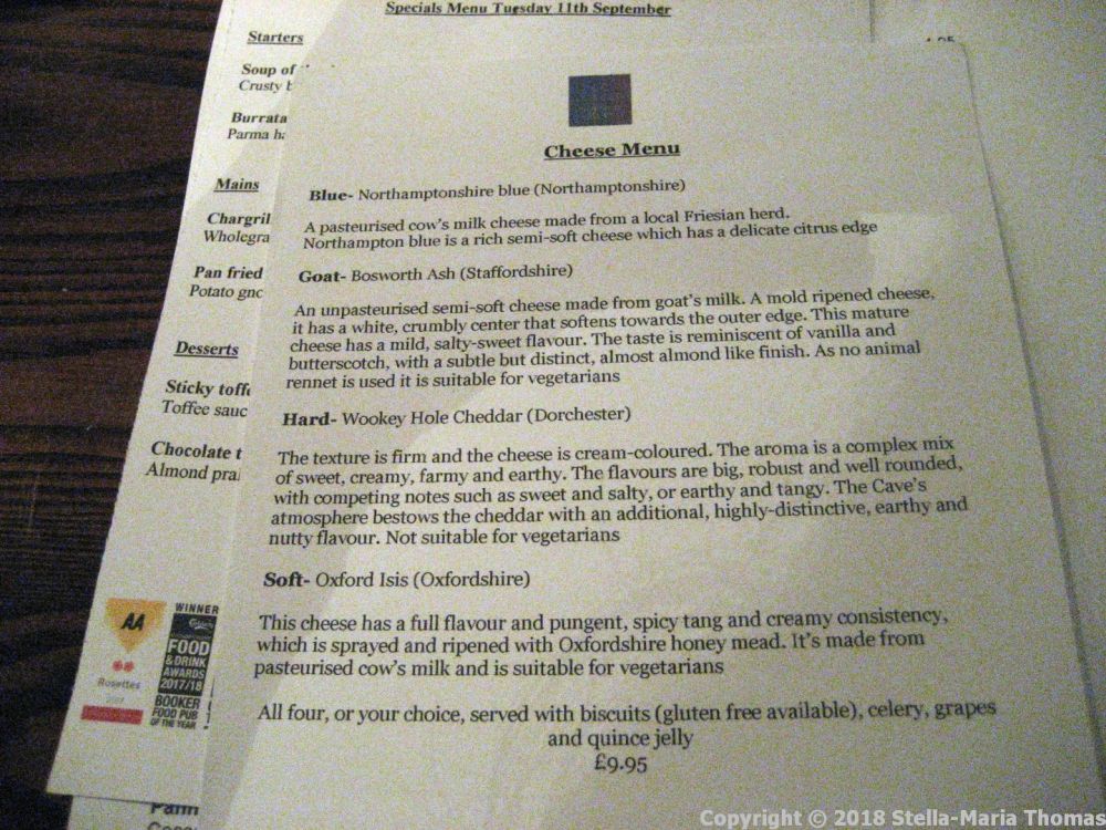 We couldn’t make a decision so we went for all four, but just one portion to share between two of us. And so, a plate of Northamptonshire Blue, Bosworth Ash, Wookey Hole Cheddar and Oxford Isis was produced and demolished in pretty short order.