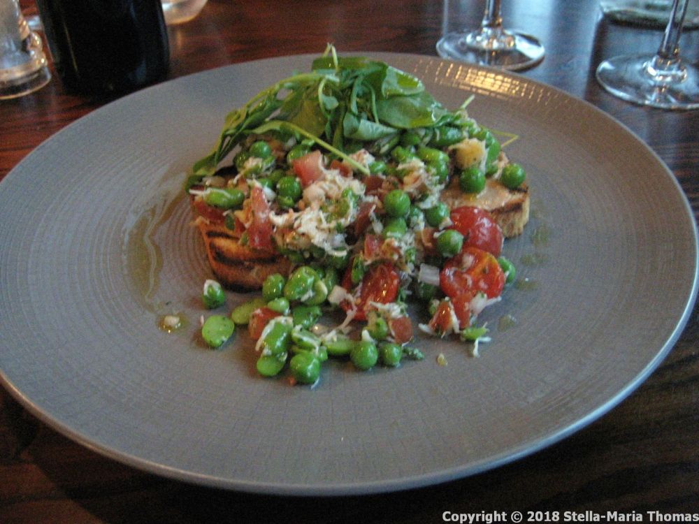 The other starter was the more interesting, being slightly more unusual, with lovely sweet Devon crab and crisp, crushed broad beans piled on sourdough toast, and swirled through with a brown crab infused mayonnaise, some lambs lettuce and a handful of flavoursome cherry tomatoes. It was a lovely thing. I’d just have liked more of the white crab, but that’s always the case. It’s a bit like mushrooms. You can never have too much white crab meat.