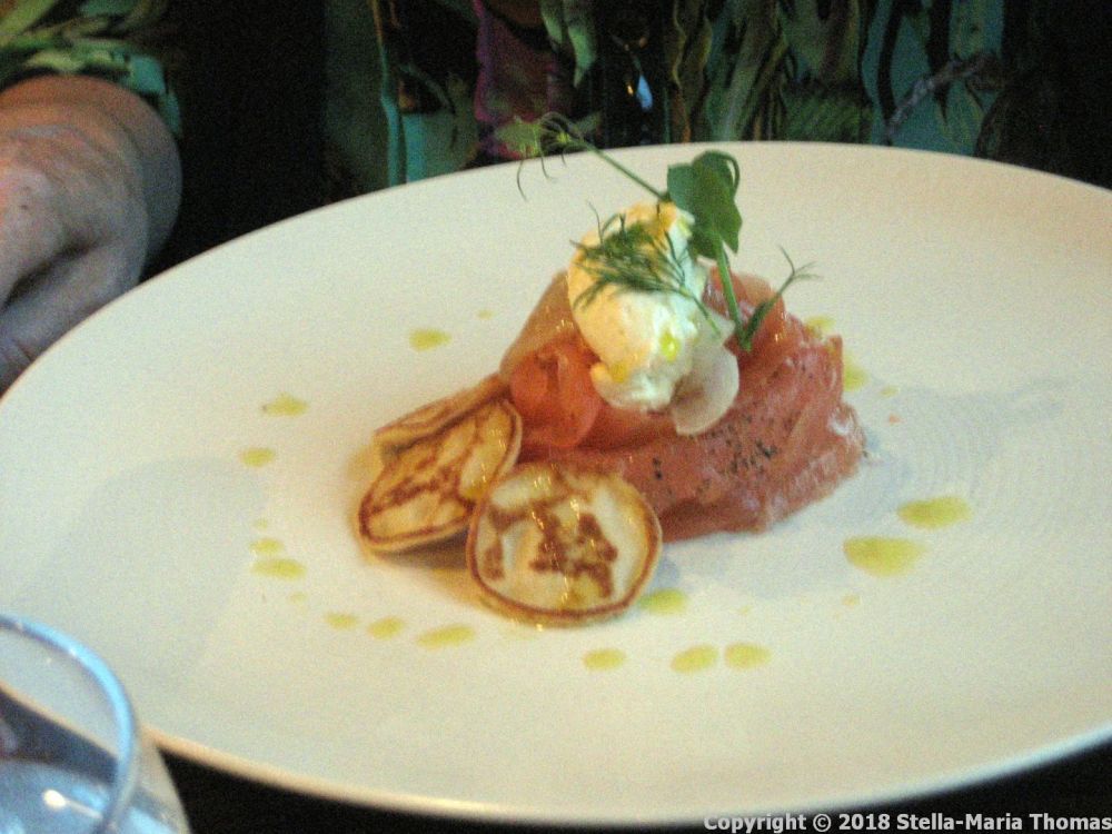 We were handed the pre-19:00 menu, the set menu and the a la carte menu and spent some time batting ideas around as to what we really wanted to eat. We went fishy at the starters stage, with a portion of their Scottish smoked salmon, which came with a nicely crunchy pickle of sweet and sour cucumber, with a big blob of horseradish sauce, and some soft blinis. It was good, though it was more a matter of advance prep work than actual cooking. Didn’t stop me from enjoying it though!