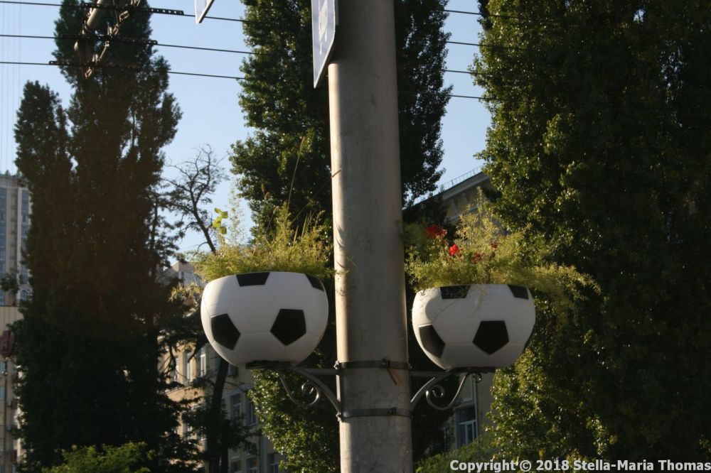 The nearby lamp posts are decorated with planters made to look like footballs, which amused us.
