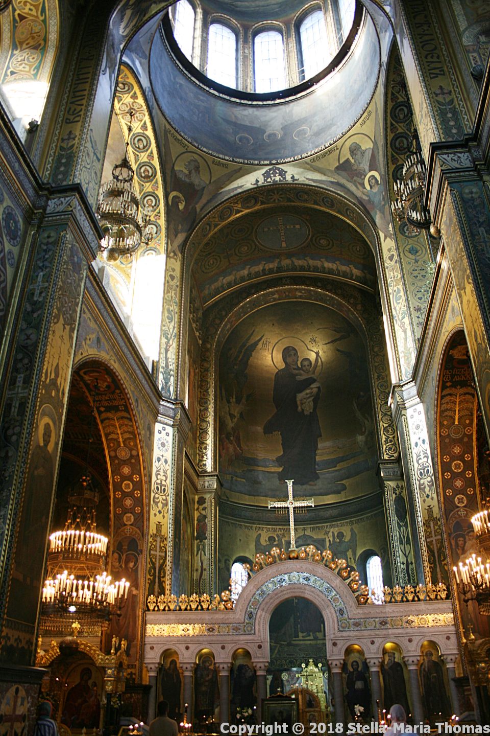 I concentrated on taking photos (there’s a small charge if you want to take photos – I was happy to pay it). The interior is absolutely stunning, with an art nouveau feel to the work that decorates every available surface. Where there are no mosaics, there are paintings, the mosaics created by Venetian masters, the paintings the work of a group of painters under the guidance of Professor Adrian Prakhov. The frescoes were completed by 1896. The interior taken as a whole is almost overwhelming to anyone more used to the stark beauty of Western European cathedrals. It was all we could both do not to just stand and gaze an repeatedly say “Wow!” to each other.