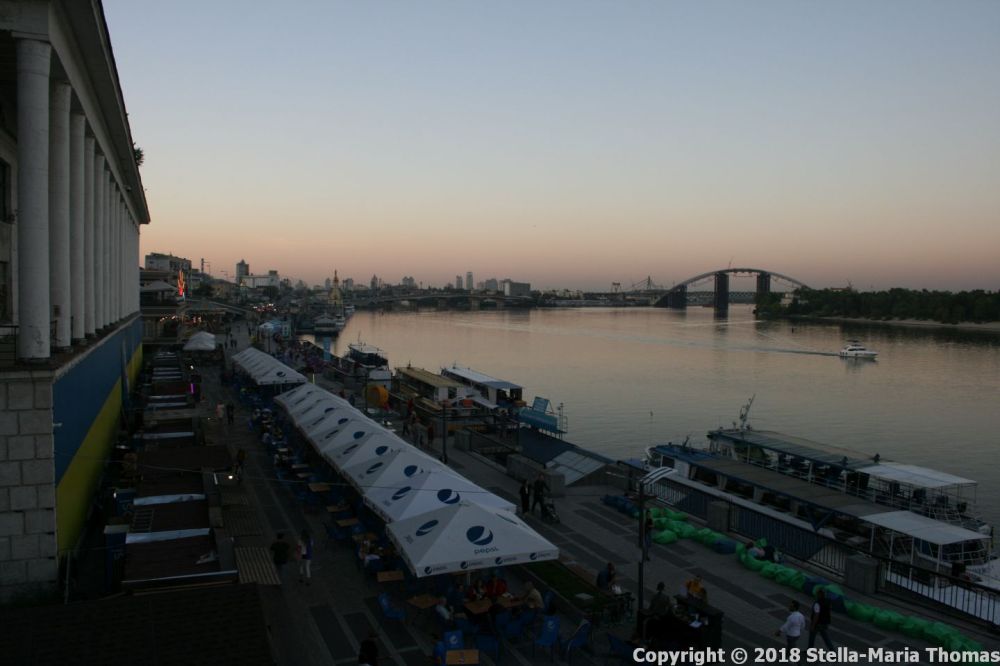 Having discovered that the funicular is part of the Metro system, and that it takes contactless payments for the 8 hryvnia fare (a stunning £0.24, 0.22€ or $0.29 US) we rode down to Podil just as dusk was falling. Podil runs along the bank of the Dnipro and is the old mercantile quarter. It seems to be where all of Kyiv fetches up for an evening stroll, cycle ride, run or simply to sit and watch the river. There is a row of street food stalls, cafes, and hotels, with various amusements thrown in.