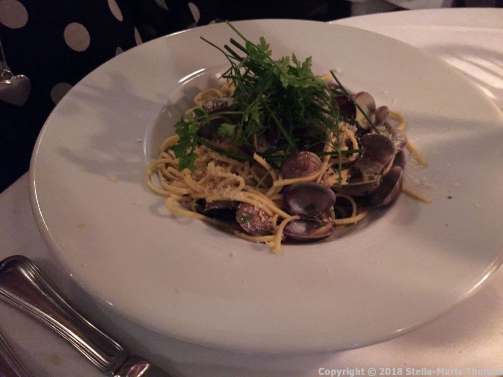 I think Maria called it better with her main choice, a very traditional spaghetti alle vongole, which was studded with clams, decorated with herbs, and seasoned with chili and garlic, with a white wine sauce. It looked and smelled divine, and another time I’ll order it instead. My own fault, I suppose, for wanting to try something completely different to the dishes commonly found on Italian menus everywhere!