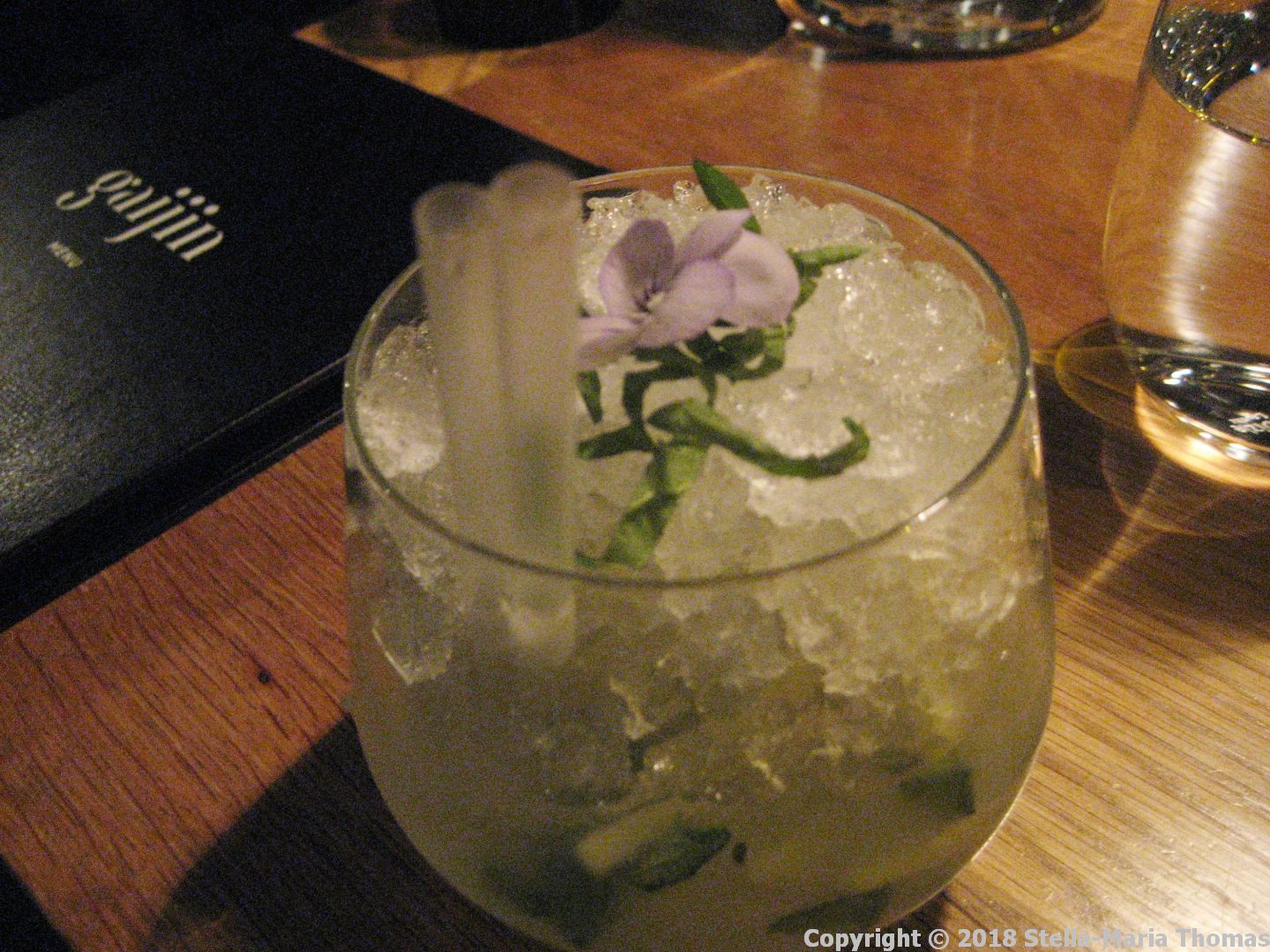We arrived slightly earlier than planned as the hotel bar was closed (also not unusual on a Sunday in Finland) and so we happily sat and drank a cocktail in the bar while our table was prepared. Lynne had a Shiso Kiri, made with Absolut vodka, shiso (a form of mint), ginger, lime and a lot of crushed ice.