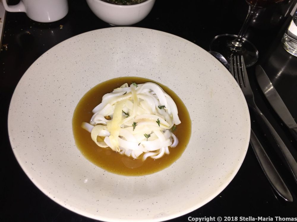 Meanwhile, I was reacquainting myself with the poached squid, which as it had in October was accompanied by ribbons of pickled white asparagus, and the deep, dark roasted chicken dashi but with parsley this time. It was as good as ever.