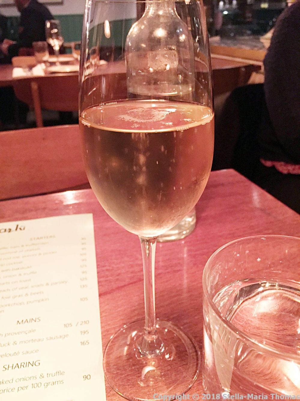However, nothing daunted I stuck my head in the door and asked if they could seat me. I was quite prepared to fall back on Plan B if necessary, but as it turned out I was in luck. There was a small table available between two already fully occupied tables. These tables are wedged in pretty close together, which I eventually concluded is a result of the cost of everything in Copenhagen, and the relative cheapness of the menu at this cosy establishment. I took a look at the wine list looking for something by the glass and opted for a glass of Champagne (for a really quite reasonable 100Kr) which was quickly supplied and quite generously filled up with Champagne Huré Frères, Invitation, Brut a lovely fresh fruity example from a supplier I’d not heard of before.
