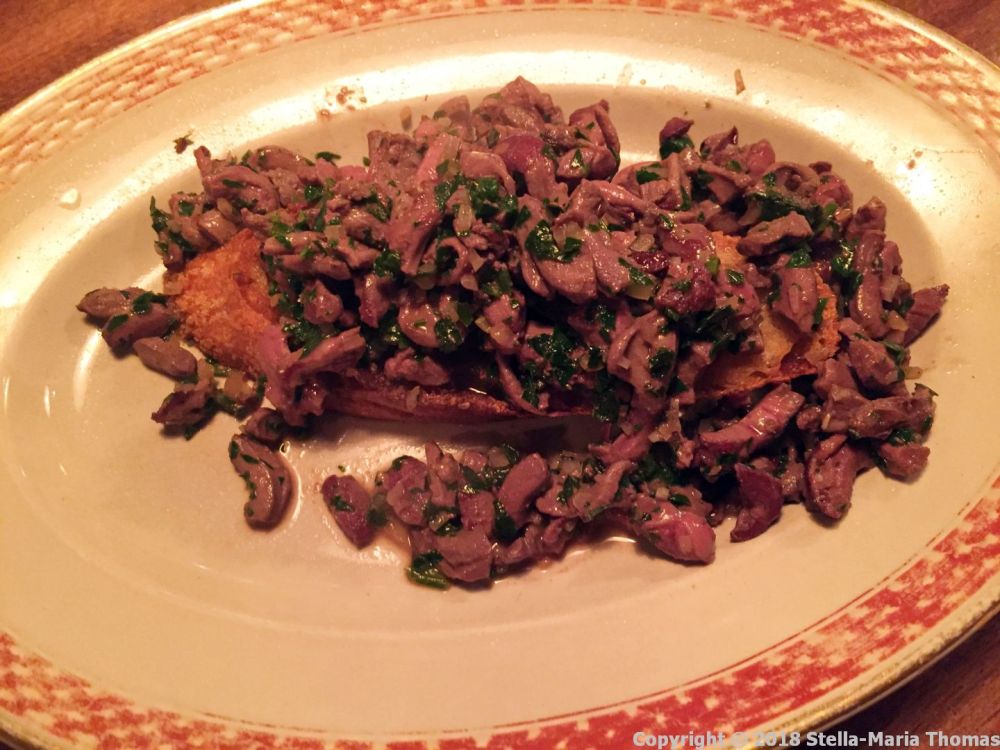 I finished my Champagne and ordered a glass of red wine to go with the next two courses, both of which were going to be extremely meaty. The Domaine Marc Roy, Bourgogne Rouge seemed to be the perfect solution. It certainly went very nicely with the starter of duck hearts, which were finely chopped, seasoned beautifully, and piled on top of a slice of sourdough toast. This really wasn’t the place for anyone trying to avoid gluten, or carbs for that matter. As I’m not doing either of those things, and I’d banged in a 9k run along the harbourside before work, I was quite happy to scarf it all down, savouring the rarely seen offal. I would possibly have preferred them slightly less chopped, and slightly more rare, but it was a glorious plateful of seriously deeply satisfying gorgeousness.