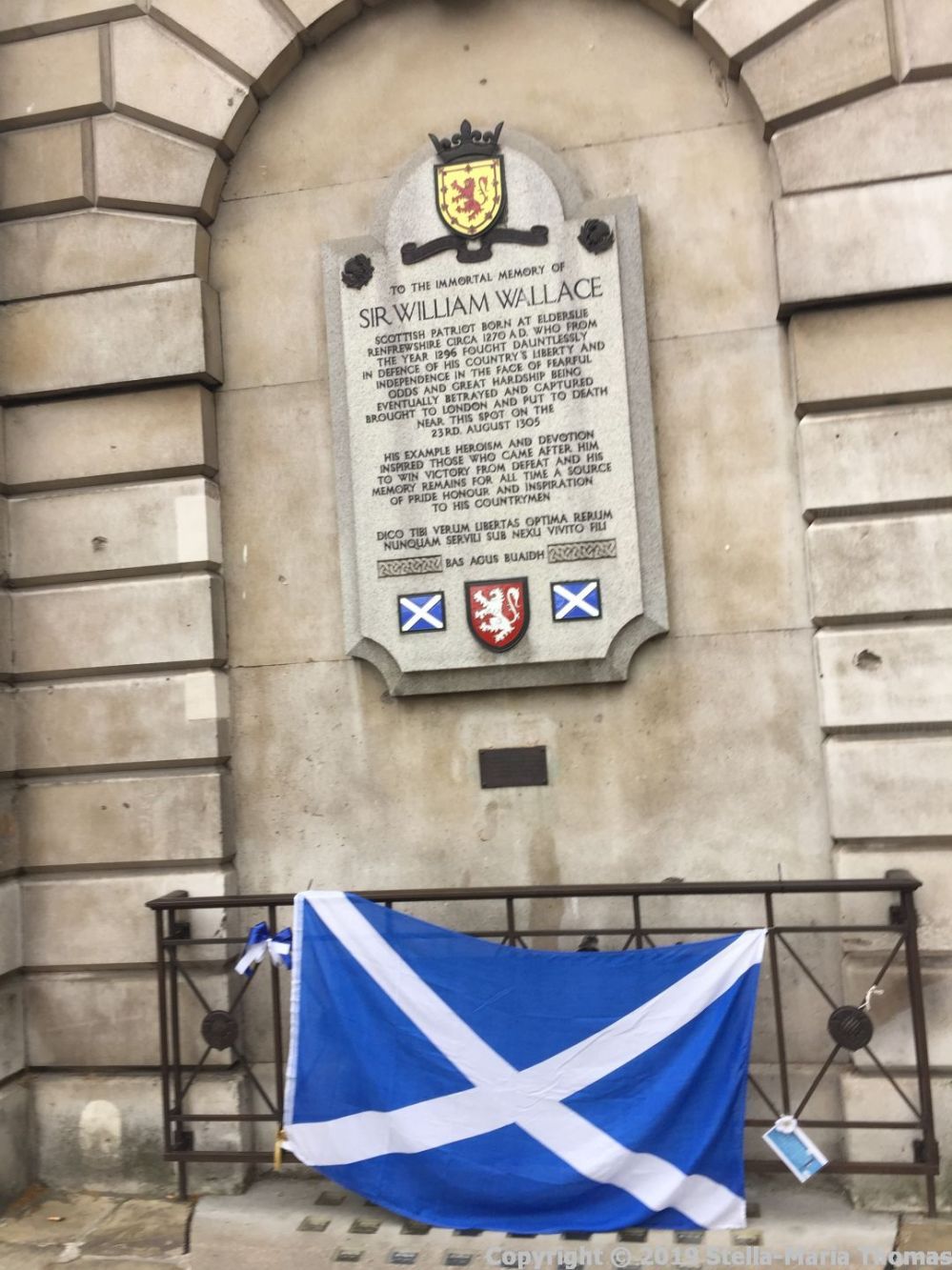 On the other side of the street from the gateway is a small memorial to William Wallace. Smithfield was, in its past, one of the most important places in London for entertainment which included jousting, summer fairs and executions. William Wallace was executed here on 23rd August 1305. he was a Scottish knight who became one of the main leaders during the Wars of Scottish Independence, and was tried for treason in Westminster Hall, despite his probably not unreasonable claim that he could not be guilty, because he had never sworn fealty to Edward I. It didn’t save him and so he is memorialised on the outer wall of St Barts.