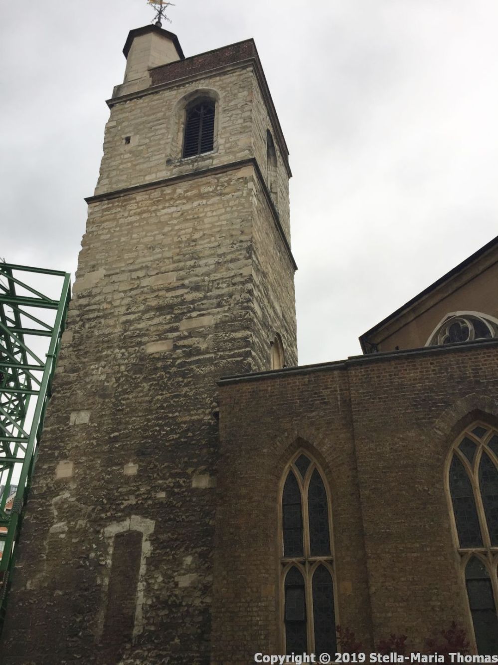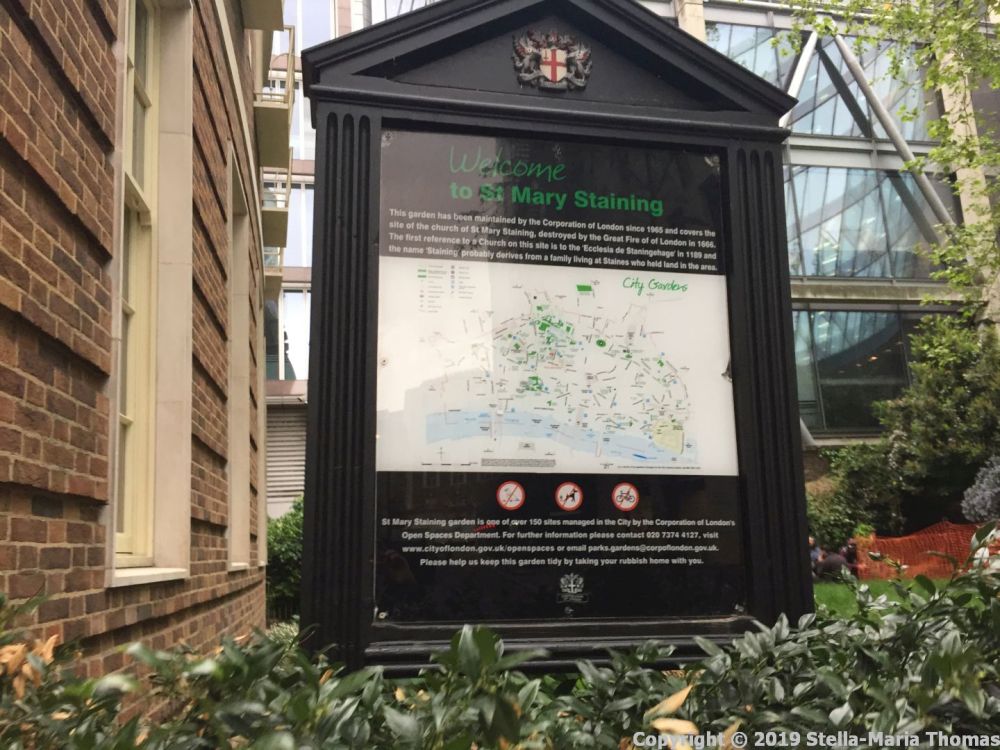 I scooted off down Gresham Street towards Pewterer’s Hall, where my employers usually hold their summer party, the garden of which used to be the site of the church of St Mary Staining. Staining seems to refer to Staines, implying that the landowner was from there.