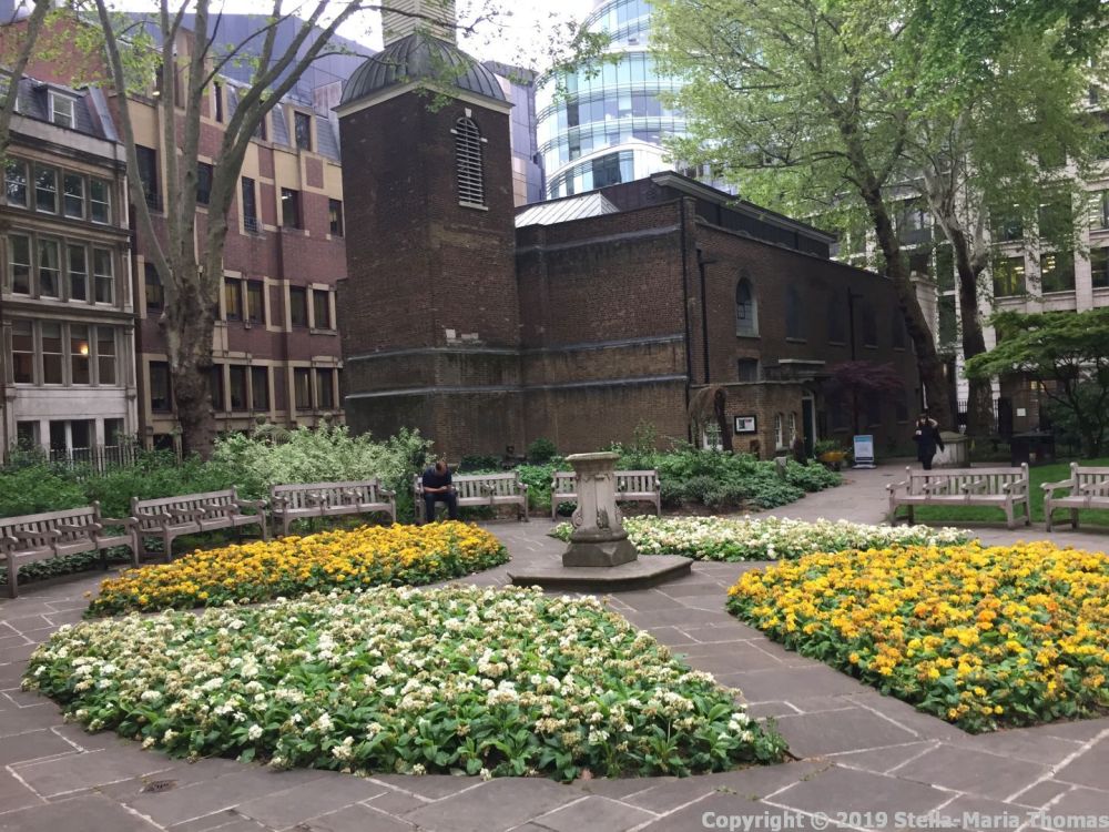 From there I needed to cross over to the wonderfully, tiny, splendidly eccentric Postman’s Park. I love this park. It’s quiet, shady, full of interest. It’s part of the site of the former headquarters of the General Post Office (GPO), hence the name, and provides one of the largest open spaces in the City of London, though it’s not exactly enormous. Prior to opening as a park in 1880 it had been the churchyard and burial ground of St Botolph’s Aldersgate. A shortage of space for burials in London meant that corpses were often laid on the ground and covered over with soil, which is why the park is higher than the streets around it.