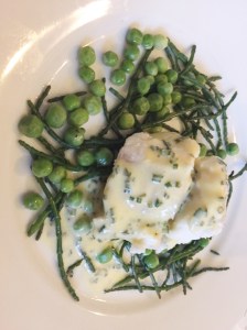 BLO DEADY, SUPPER CLUB, WESTON HALL POACHED MONKFISH WITH CHIVE HOLLANDAISE, SAMPHIRE, NEW SEASON PEAS AND JERSEY ROYALS 004 Posted by Stella on 27/10/2019