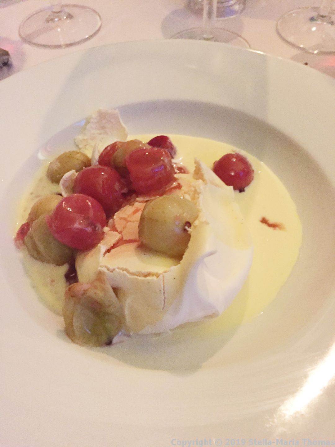 BLO DEADY, SUPPER CLUB, WESTON HALL SOFT MERINGUE WITH POACHED GOOSEBERRIES, CREME ANGLAISE AND SWEET GERANIUM 005 Posted by Stella on 27/10/2019