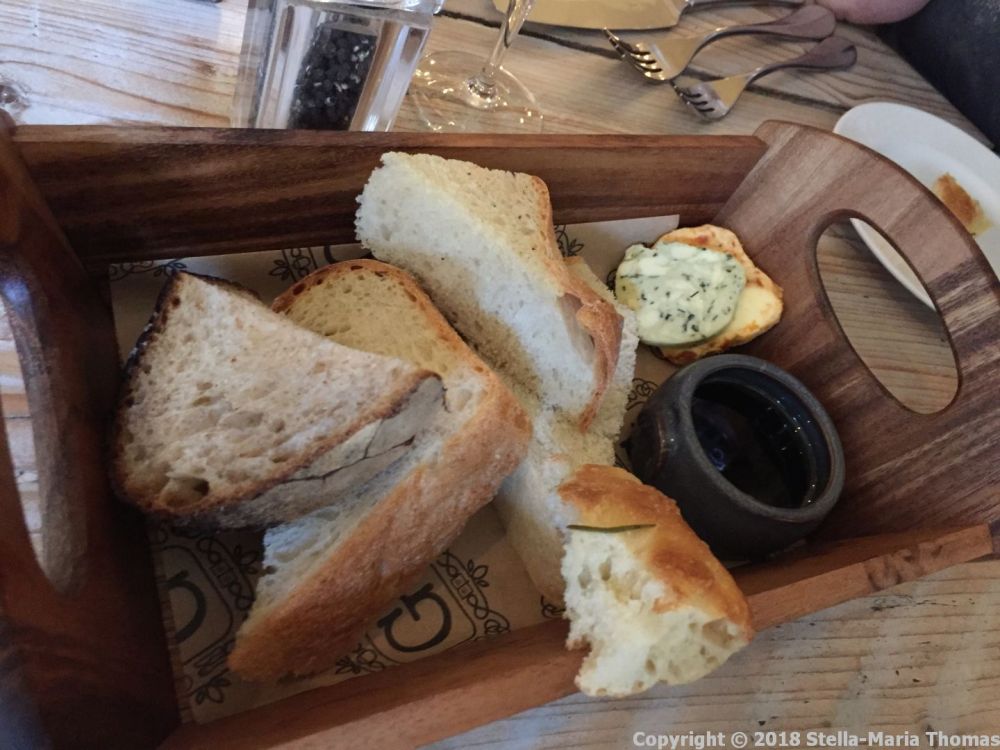 We left the bar very happy in every sense, and were soon ensconced in a downstairs nook at the Garage and mulling over the menu while we made inroads into the bread basket, complete with its two types of butter (pesto, sun-dried tomato), olive oil and balsamic vinegar.