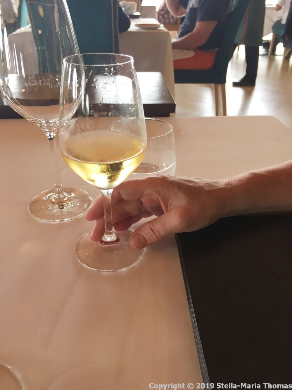 We decided we’d choose the included wines to go with the starters, which were described as tomato gazpacho with basil foam and rustic tomato bread toast and traditional Portuguese smoked sausage of meat and bread in filo pastry with sautéed greens and a Port wine reduction. We chose one of each and the sommelier popped across with his recommendations by the glass. The gazpacho was superb, the foam light and full of basil flavours, at its freshest, and the tomato bread toast was more a crispy crouton than a piece of not very interesting toast. It went nicely with a glass of Oboé Douro Branco 2017, a pale yellow wine, citrussy and floral and ideal with tomatoes.