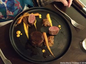 THE CLARENDON, YORKSHIRE DALES VENISON (PAN FRIED LOIN, BRAISED LEG, ENDIVE & ORANGE MARMALADE, SMOKED CARROT PUREE, GLAZED CARROTS) 008 Posted by Stella on 11/08/2019
