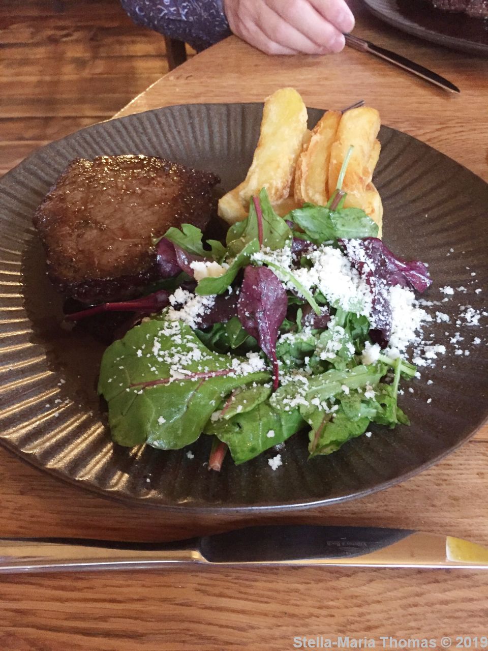 THE HOVINGHAM INN, 10 OZ FLAT IRON STEAK, CHIPS, PARMESAN & TOMATO SALAD, RED WINE SAUCE 024 Posted by Stella on 12/08/2019