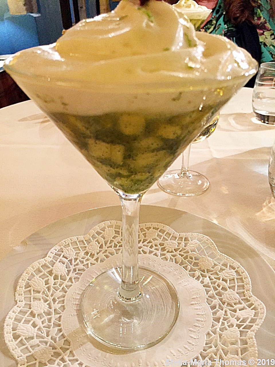 The second course was a crayfish casserole, tiny and packed with pieces of sweet-fleshed, juicy, tender crayfish tails, dotted with chives and swimming in a creamy sauce. I loved it (and the little Staub cocottes it was served in, which are from a brand that started in Alsace, and that cost an absolute fortune). I pondered the possibility of getting out of there with one hidden in my handbag! the sheer weight of it put me off the idea, if Lynne had not also vetoed it. We already had a fabric heart that was in our room as a present from the hotel when we arrived. That would be far easier to carry… I settled for mopping up the sauce with the bread roll and we sat and waited to see what else we would be fed.