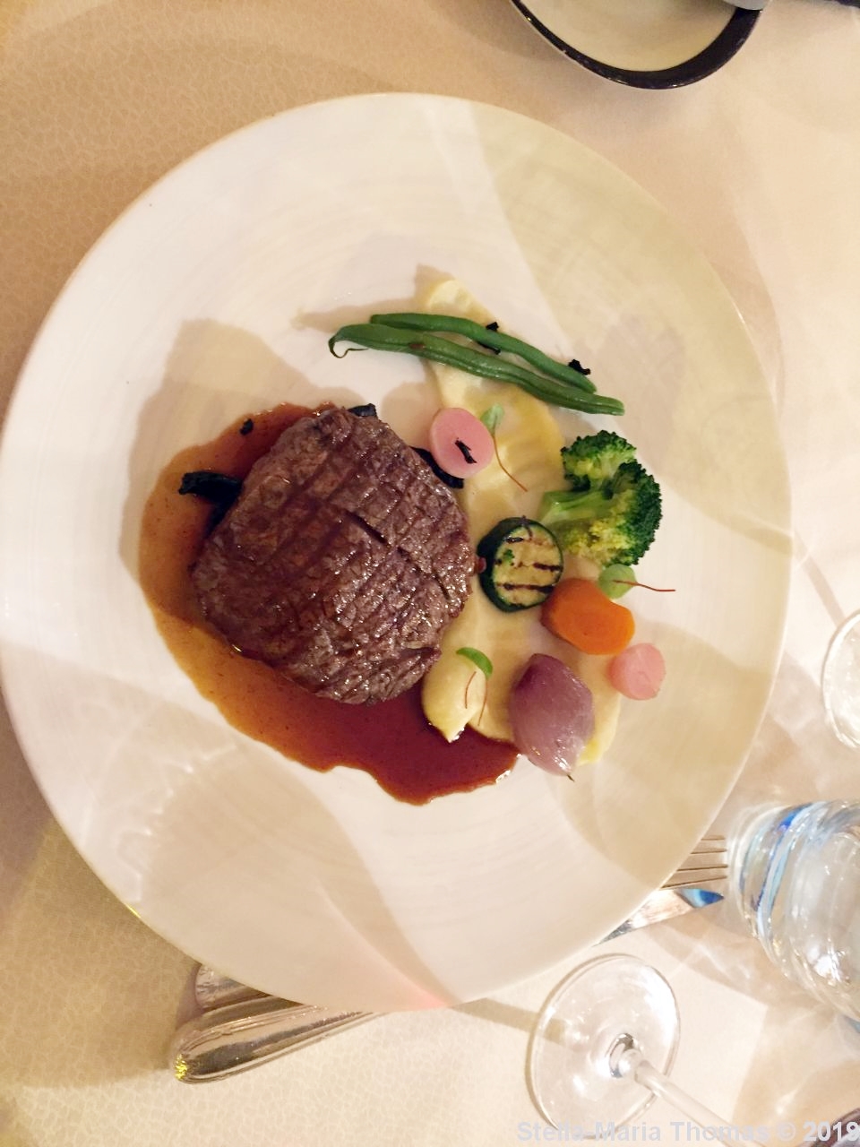 We finished off with a gourmandise du pâtissier which took the form of a gloriously gooey plum and raspberry confection, on a biscuit base that couldn’t be faulted, the ice cream all creamy and rich and the sorbet sharp and cleansing on the palate. It was looking good for our second night, and we went to bed happy after finishing our dessert wine (and cheering when the annoying pair behind us had cleared the room and gone to their own beds). It made the wine taste even better, which, as it was a 2017 Gewürztraminer Tradition – Gold Medal wine from Bott Frères was quite a smart trick. The wine is brilliant and crystal-clear in shades of light green and has a youthful, fresh and flowery (rose and acacia) aroma, added to an exotic taste of pineapple and oriental spices characteristic of Gewürztraminer. Perfect with dessert and on its own, as we went on to prove!