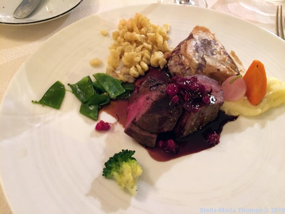 With both the fish dishes we drank a 2018 Alsace Pinot Blanc from Pierre Henri Ginglinger. The wine comes from a blend of Pinot Auxerrois from different parcels, harvested by hand and fermented over several months before being aged on fine lees. It’s a bright yellow in color, with white-fleshed fruit aromas, and peach notes. We liked it enough to make a note of it and to consider whether we needed to visit the Ginglinger domaine. While we pondered that question, the meat course arrived, a serving of leg of deer with cranberries, cross-border pasta specialty spaetzlés (as the French appear to spell it) and fromage blanc. The meat was cooked to perfection, as were the vegetables and to add a fillip to what might have seemed quite a restrained plate, there was also a “pastilla” full of slow cooked meat to enjoy alongside the pink cooked flesh that we’d been expecting. It was all beautifully executed and we knew we’d made a good choice to eat in the hotel.
