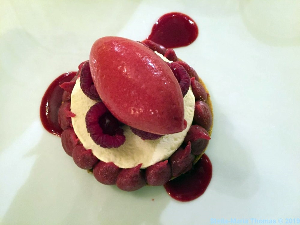 The second fish dish was a piece of nicely filleted halibut, in a saffron sauce. Saffron is tricky stuff – overdo it and you have a sauce that is bitter and deeply unpleasant. Get it right and you have something golden and warm. They got it right and the fish was also perfect, white and flaking and moist, sitting on a small pile of fresh carrots and a pool of pale golden sauce. Both this and the crayfish came with a 2016 Grand Cru Froehn Riesling from Jean Becker. This wine is made from grapes grown on limestone and sandstone at 270 to 300m on soil consisting of dark gray schistose marls, with fine white limestone beds as well as carbonate and ferruginous nodules. The wine resulting wine is floral and fruity, combining richness, finesse and breadth regardless of varietal and there is a fine and strong acidity that becomes salinity and minerality with aging. Am excellent choice once again. Someone really knows their wine and food matches, and they want you to have the best Alsace can offer