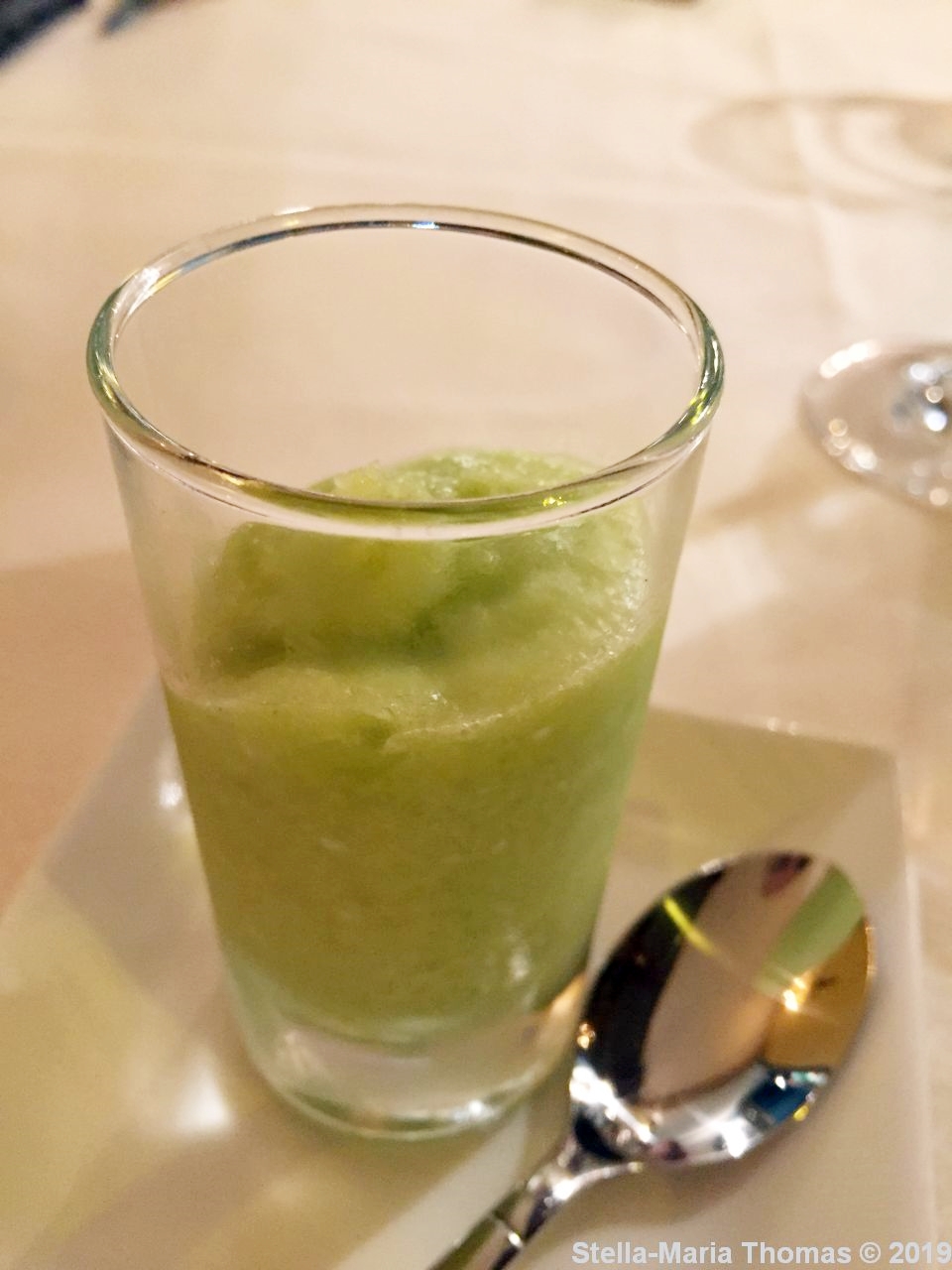 On our return we decided it was getting a little too cold to stay out for a second aperitif so we took to the room just off the hotel’s courtyard for a second glass of wine and some more of their fabulous pastry straws, before swinging indoors to see what was on offer on the tasting menu. As ever they started us of with a delicate little amuse-bouche before things got serious. We’d deliberately avoided anything after the charcuterie plate at Joseph Cattin’s for the remainder of the day because we reckoned we’d be best arriving hungry. We didn’t even do the flammkuechen as aperitif nibbles thing because that seemed unwise. This time they started us with a cheesy mousse and a tiny tomato gazpacho, which was refreshing and sharp.