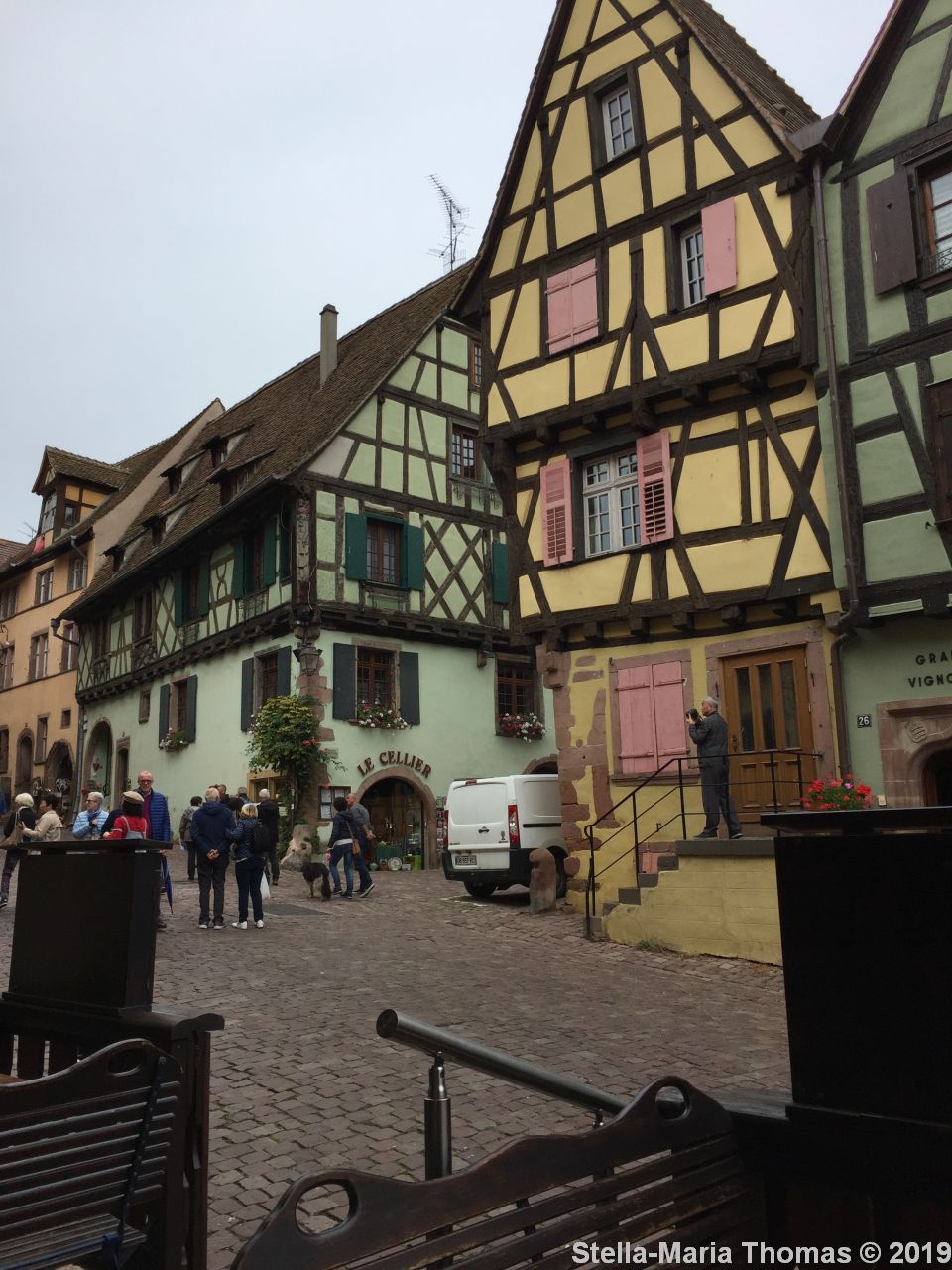 There were also a lot of guided tours going on, but we opted out and decided we’d go at our own pace and stop off to look at whatever we wanted to see. It was quickly clear that the place does not look very different to how it would have looked in its heydey, and it’s no surprise to find out that it is another of the “most beautiful villages of France”. It was doing its best to live up to that reputation when we visited. It has a population of just 1,250, so I suppose it’s more of a village than a town but I really don’t know quite where the dividing line is in this part of the world, but it’s beautiful out of all proportion to its size. It lies at the bottom of the Schoenenberg hills, at the foot of the Vosges mountains and the terroir makes it perfect for growing Riesling wine.