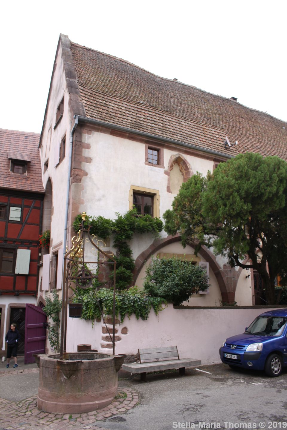 We were directed next to look at a number of houses including the House of the Gourmet which was interesting both for its decoration, and the fact that the title was that of the person who acted as a sworn intermediary between the wine makers, finding them customers and arranging tastings for the wine merchants, and that dates from 1686 in its current incarnation. We got slightly sidetracked after that as we tried to avoid a bunch of guided tours, but then poked around in the court of the winemakers, a series of stone buildings rather than the more traditional – and much cheaper – wattle and daub. The winemakers were clearly doing very nicely at the time, because only the wealthy could afford to build in stone, and Riquewihr apparently has the largest number of stone houses in Alsace.