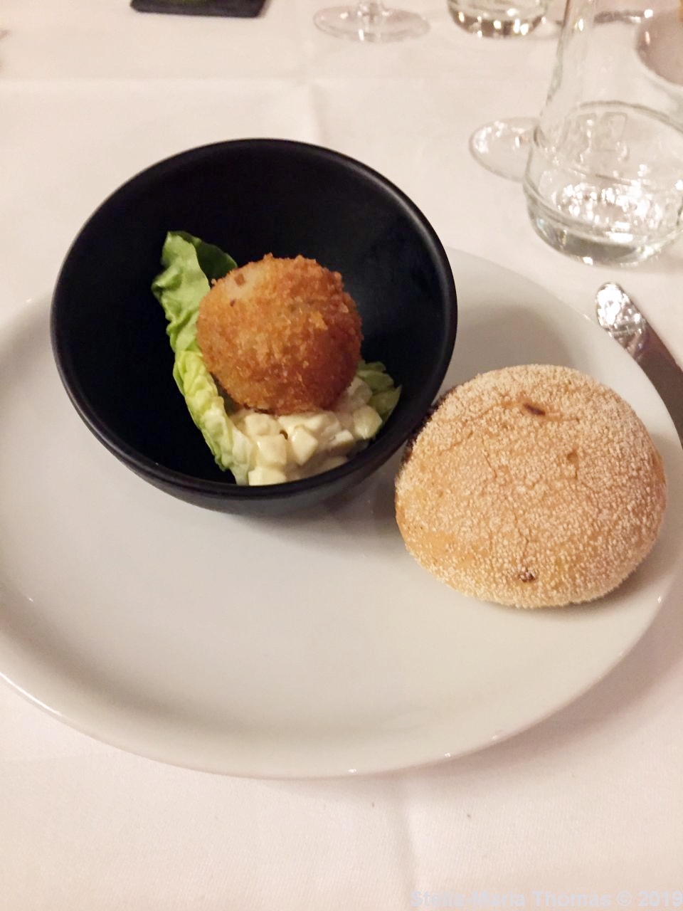 We took a look at the wine list (and noted some Dutch wines on the list which could have been interesting) but decided we would trust the wine choices that had been made for the dishes. Our waitress clearly understood the wines, and the wine list, and might actually be the sommelier as well. We never did figure out quite who was in charge of the wines, but she was certainly incredibly well-informed, even if she couldn’t taste any of them any more because she’d just found out she was pregnant. We were brought an amuse-bouche and this being the Netherlands it was a croquette. This one was made with “old” cheese so I assume they mean matured Gouda. It was good, cheesy and crisp, and very, very Dutch, but in a good way – Dutch cuisine often leaves a lot to be desired, is all I’m saying, but when it is good, it’s very good indeed. I put most of it down to their dour, Calvinist history which means you’re not supposed to take pleasure in anything. They do seem to be getting over it now.