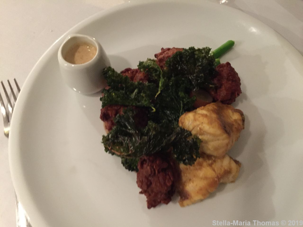 WHITE PEACOCK CURRIED MONKFISH, AUBERGINE PUREE, CAULIFLOWER BHAJIS, PICKLES GRAPES, CRAB AND BASIL SAUCE 008 Posted by Stella on 21/10/2019