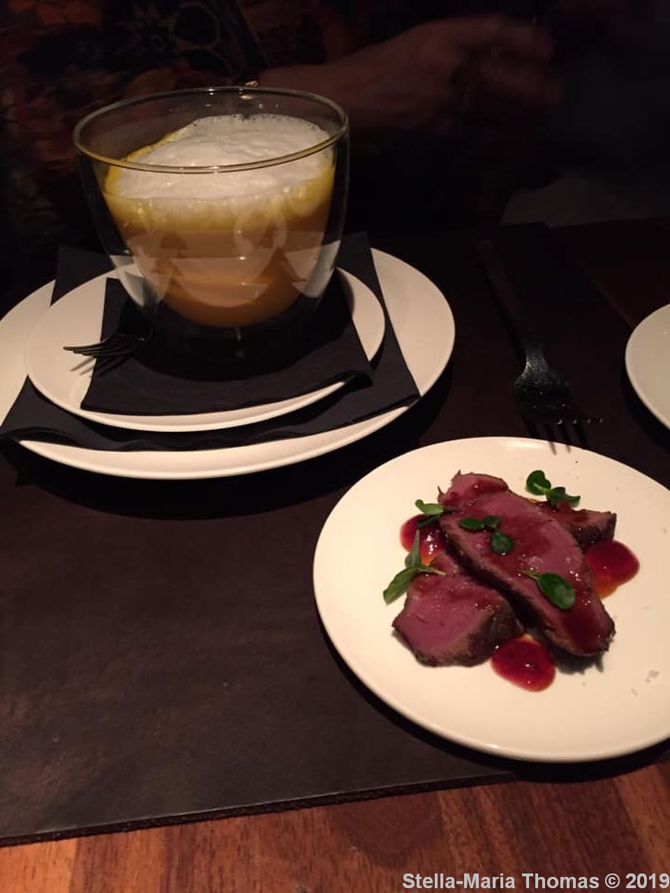 She had chosen the cream of crustacean soup, which I would have gone for, especially as it came with a perfect couple of slices of venison fillet. It looked and smelled amazing, but I didn’t dare risk it. She said it was very, very good, and seemed to enjoy it immensely. Just as well my potato soup was as good as it was!