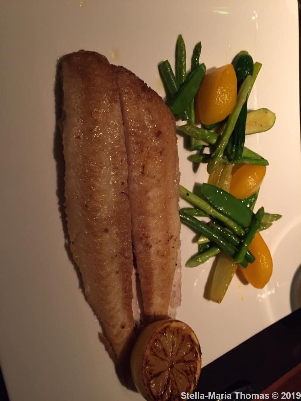 Once there we were greeted efficiently and led to our table in a large room, on several levels, with the massive plate glass windows providing a view of the lake and the twinkling lights outside for every table. I doubt there’s a bad seat in the room, and the wooden furniture gives the place warmth at night. We settled in, and as ever had a glass of sekt while we studied the menu. The place is big on steaks, and claims in fact to serve some of the best steaks in Hamburg, but it also does more interesting things too, especially around fish.