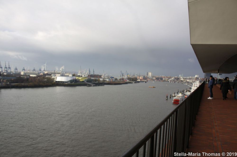 From the Plaza the foyer of the concert hall can be reached. The easternmost part of the building is the Westin Hamburg Hotel, with 244 rooms between the 9th and 20th floors and a lobby on the 8th floor. There are 45 luxury apartments on the western part of the building, and the place is dotted with conference rooms, restaurants, bars, and a spa. It’s all very impressive, although on a cold, windy day it was also incredibly cold, with gaps in the glass which I assume are to let air in and out, serving to funnel a freezing wind through the plaza (and possibly being the cause of the damage to the cafe door, where a whole plate of toughened glass was crazed and broken). We nosed around a bit though we couldn’t get into any of the concert halls (that would have required a guided tour ticket or a concert ticket), and then grabbed a coffee to try and warm up as we watched other people wandering about and confusing themselves thoroughly. Seated at the sharp end overlooking the water we watched a rain squall swoop in and wash out again.