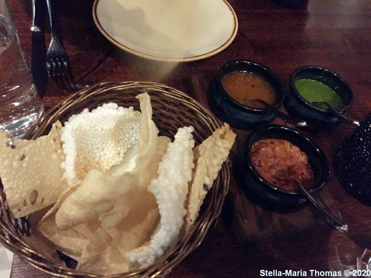 TRISHNA, POPADUMS WITH PRAWN AND TOMATO CHUTNEY, MANGO CHUTNEY AND MINT RAITA 003 Posted by Stella on 17/02/2020