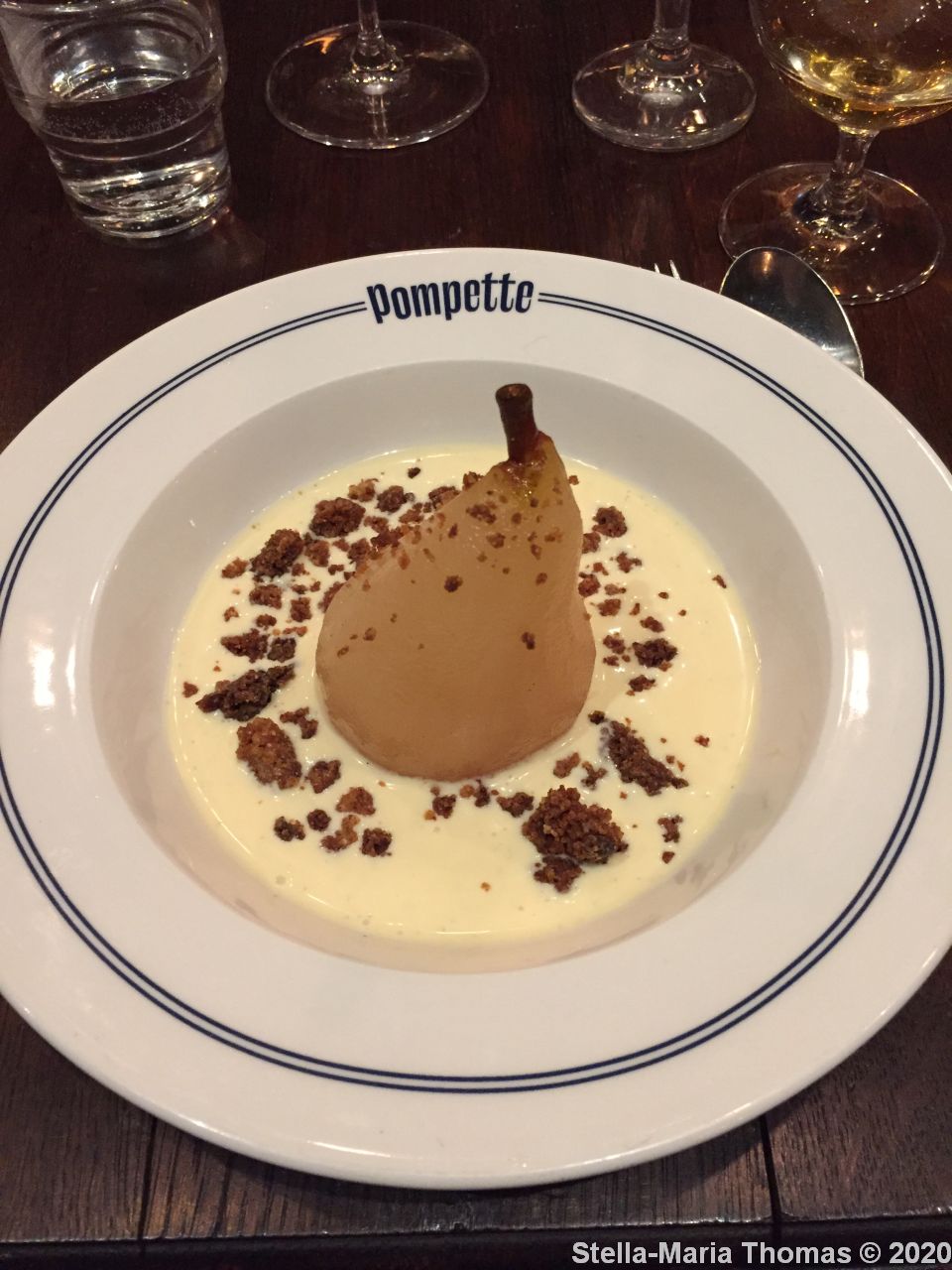 The last course was an expertly judged poached pear with crème Anglaise and a pain d’epice crumb, that was sweet and crunchy and lifted the dish from something good to something spectacular. It was accompanied by an extremely good wine, but also a fierce shot of poire William eau-de-vie which left us wishing we weren’t the only people without a B&B close by. We would have to get home afterwards…