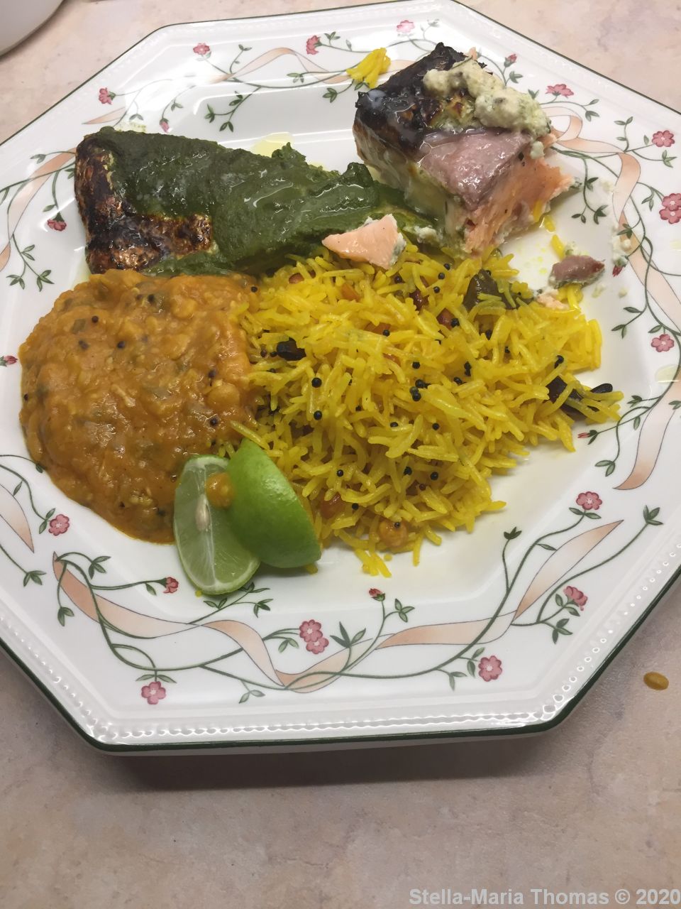 Having demolished the starters, I then needed to put the two fish dishes into the oven for 20 minutes or so. The salmon was meltingly tender, the marinade mild but complex with plenty of warmth without being fierce. The bream was also perfectly cooked, the haryali marinade packing quite a punch in contrast, with a lot of coriander, mint and chilli, undercut by the sweet sour taste of amchoor (powdered mango). It’s my understanding it’s often used with chicken, but it was perfect with the bream. With naans and lemon rice to soak up the juices, and an accompanying rich, smooth, deep dal panchmel it was an excellent meal (though Lynne didn’t care for the dal – she doesn’t like the texture of lentils).