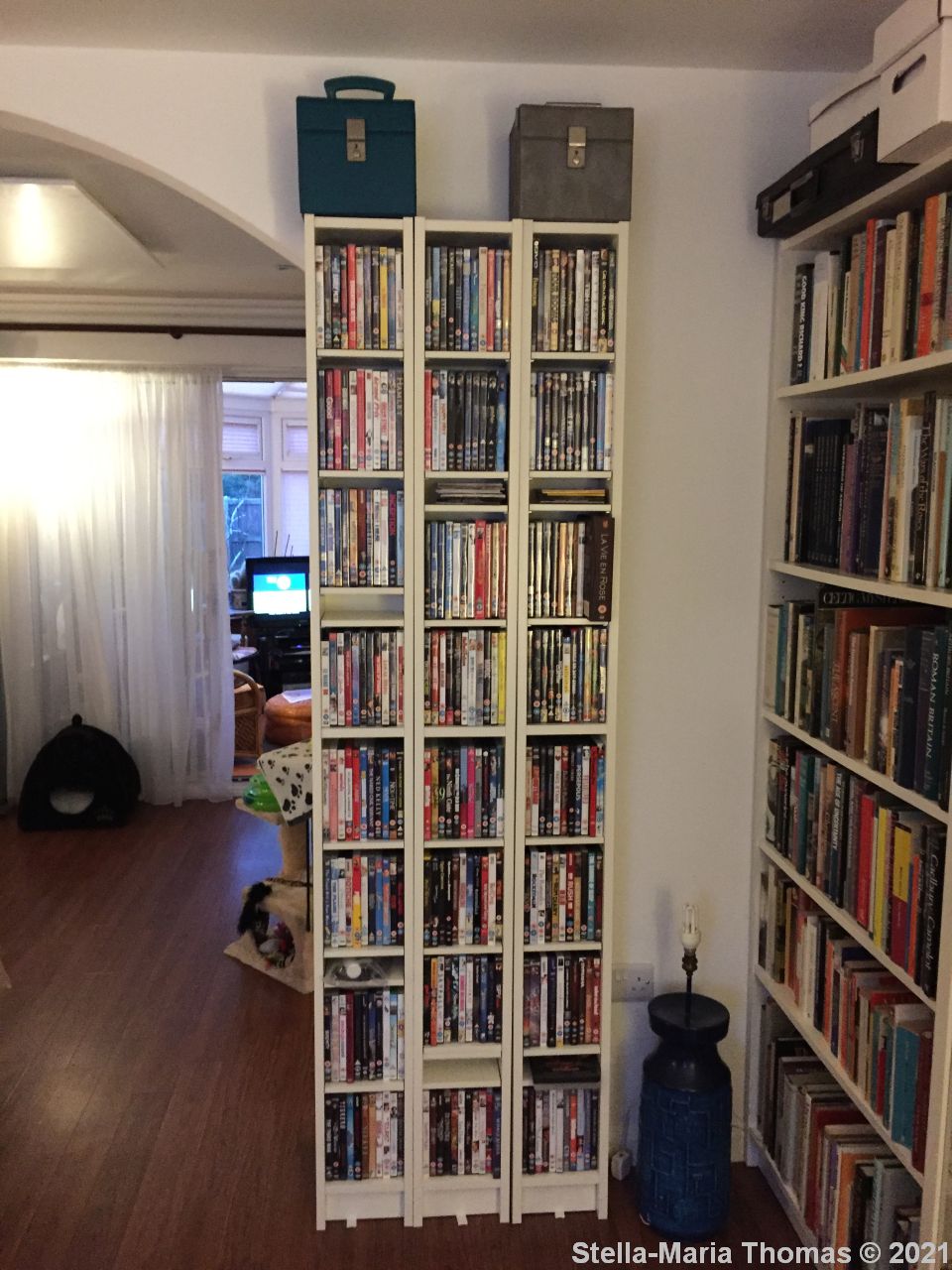 Friday afternoon we sorted all the DVDs, CDs, and such like. This was complicated when I looked into one of the boxes that was labelled as being all 12-inch LPs, but that was rattling oddly if that was really the case. It wasn’t. It was more bloody CDs and DVDs, so having thought we’d finished, it turned out we really, really hadn’t, and we had to reshuffle everything once more.