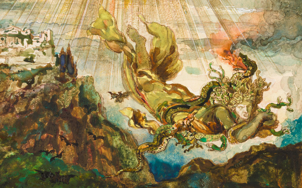 We both thoroughly enjoyed the art exhibition we’d come for as well.  This displayed a collection of glorious lapidary watercolours by Gustave Moreau (1826-98) which illustrate the Fables of Jean de la Fontaine. They vary in style, but they are all stunning, full of tiny intriguing detail. There are 35 of them, and they were painted 1879 and 1885, at the behest of Antony Roux, an art collector. They were exhibited in Paris in the 1880s and in London in 1886. There were originally 64 pieces, which were collected by xx Rothschild, but sadly nearly half of them were lost during the Nazi era. If you know your Aesop, many of the pictures will make sense at first glance, but there were others that didn’t so we were pleased that the explanatory texts were so good. We weren’t allowed to take photos in the exhibition, understandably, so here’s a couple I found online!