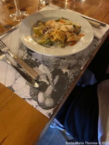 DOC SHADOW WORKSHOP, DAY 3, SPISELOPPEN, CRISPY SCAMPI WITH SESAME AND GINGER, SALAD TOSSED IN A RED SALSA, ROASTED PUMPKIN SEEDS, PARMESAN, CROUTONS 005 Posted by Stella on 11/10/2023