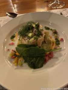 DOC SHADOW WORKSHOP, DAY 3, SPISELOPPEN, RILLETTES OF FRESH AND SMOKED SALMON WITH SMOKED CREAM CHEESE, HERB BLINIS WITH BABY SPINACH AND RED ONIONS, LEMON AND BASIL DRESSING 004 Posted by Stella on 11/10/2023