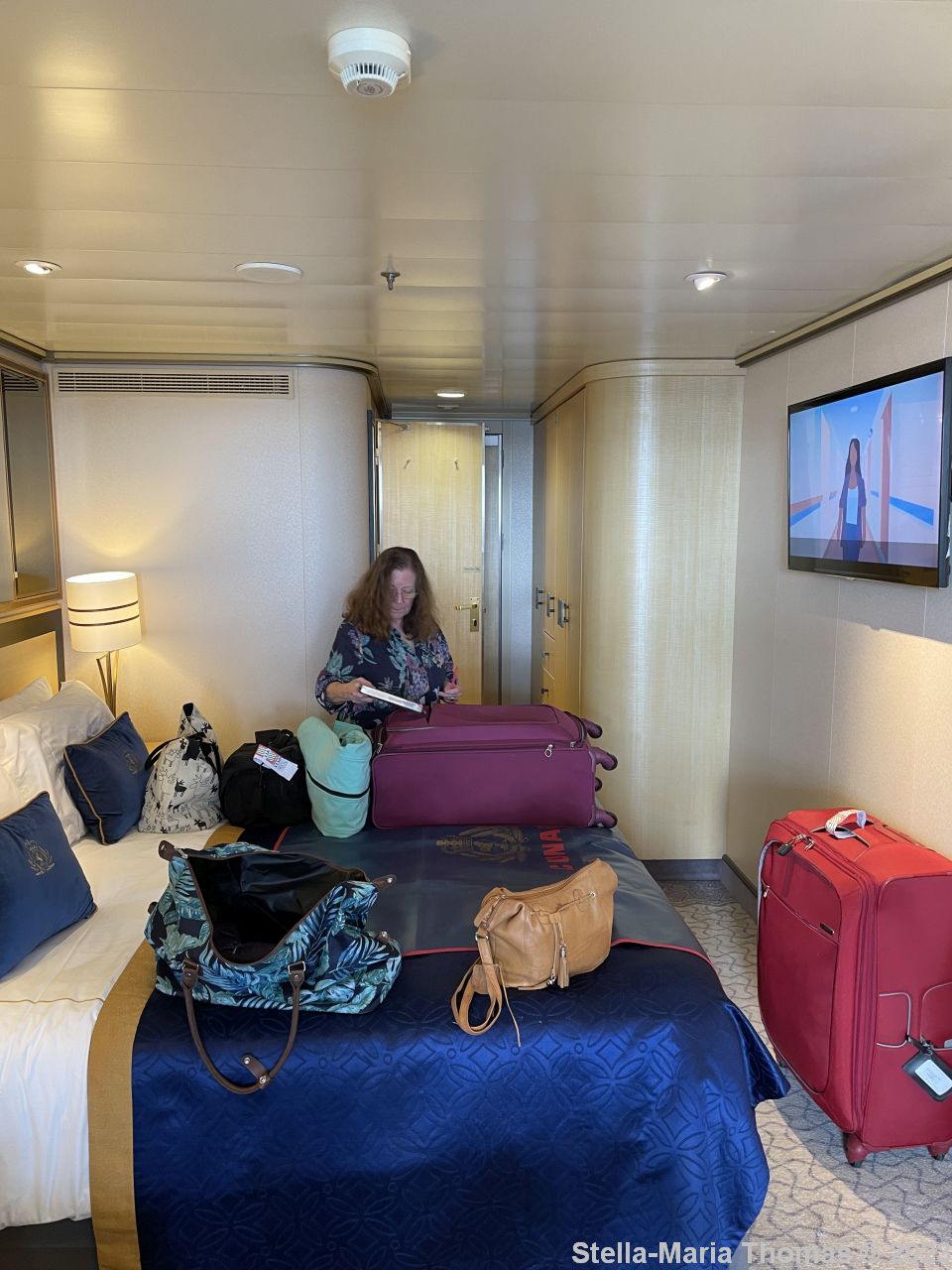 We dropped our enormous bags (we’d packed probably far more than we would need, ‘just in case’), then joined a very short, fast moving queue. We needed to be photographed, so that it was clear we were who we said we were, and then we were handed individually addressed envelopes with our key cards. Another short queue for passport control, and an even shorter well-managed queue to go through security with our hand luggage, and we were walking up the gangplank to the ship.