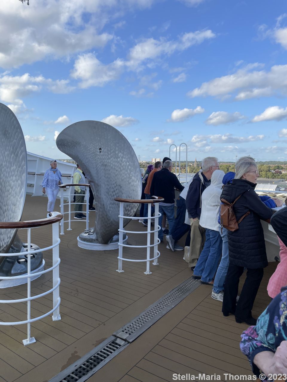 We also found the kennels, which are apparently only used on transatlantic crossings for both dogs and cats, and which has its own lamp post, much to our amusement. Oh, and these are not sculptures, they’re spares (propeller blades), believe it or not.