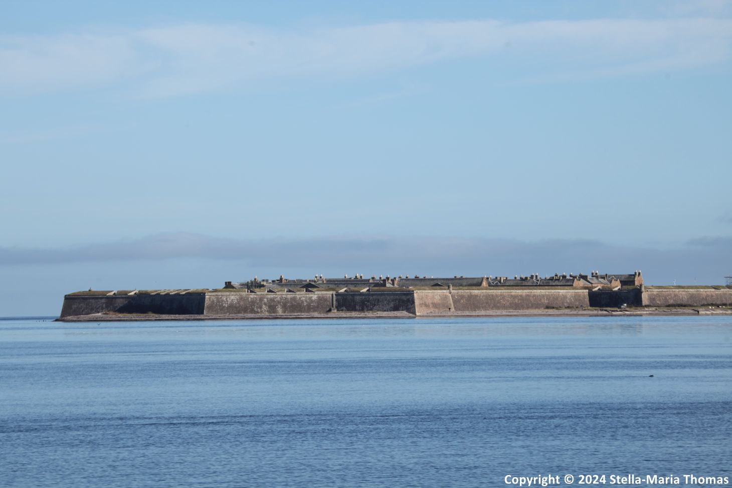 A cheese scone and a latte were refreshment enough and we were soon on our way to Chanonry Point. Described as “a spit of land extending into the Moray Firth between Fortrose and Rosemarkie”, it’s not easy to access and I imagine in Summer it’s utterly rammed. The car park is on the small side (and not free) and the route through it runs straight through the middle of a golf course. When you get there you are first faced with the lighthouse, which is situated at the tip of the point. It was designed by Alan Stevenson and came into service in 1846. It is now fully automated although there’s a notice outside saying that it’s a private home and that people shouldn’t park across its gates which I suspect is related to the sheer numbers of visitors. And that happens because Chanonry Point is one of the best places in the UK to view dolphins. Unfortunately, wherever the dolphins were this day, they were NOT at Chanonry Point. We saw not a trace of them. We did see several seals at a distance, and a lot of avian wildlife, but of cetaceans, not a trace. It didn’t matter. It was a glorious day, the views were stunning, and we could see Fort George (a fort built in the wake of Culloden in 1746) clearly. Historic Environment Scotland say that “Fort George is the finest example of 18th-century military engineering anywhere in the British Isles, though the army base never fired a shot in anger. Today, the fort would cost nearly £1 billion to build and equip.” It certainly looms large on the horizon from here (and there’s a seal in the foreground if you looks closely).