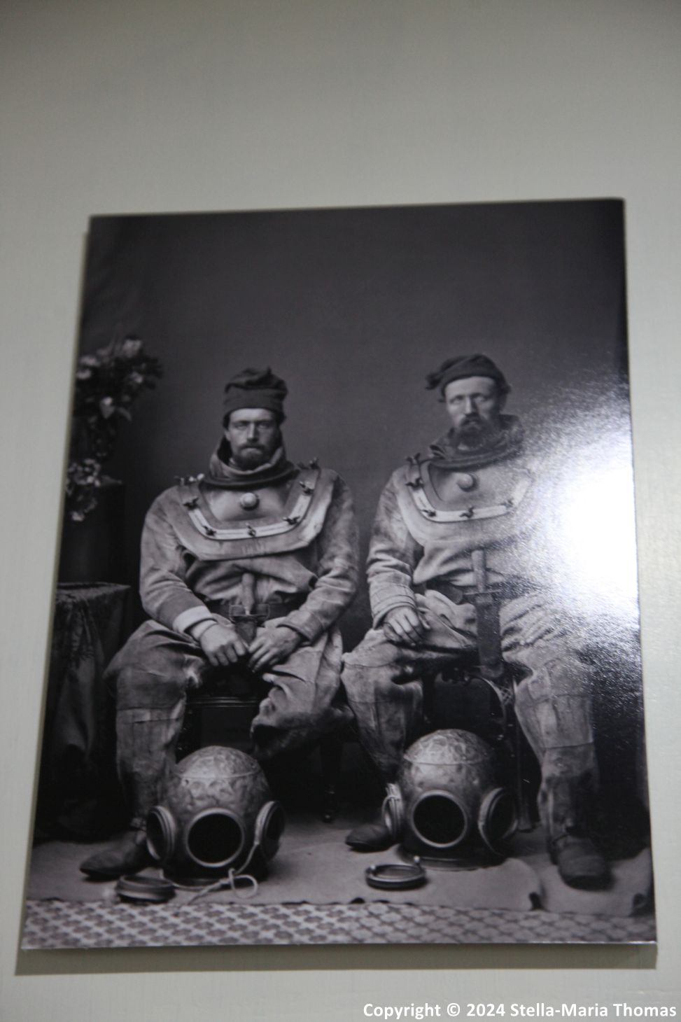 I like the picture of the divers. There is a diving suit just like it at the Immingham Museum close by where we live. Apparently, or so I am led to believe the suits were made in one piece and the diver had to wriggle in through the neckline. Looks impossible to me unless it was Houdini.