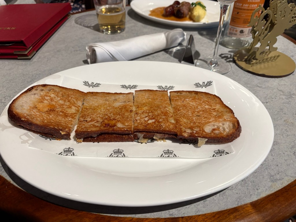 The cat had been dropped off at the cat hotel (or cat jail as he sees it), and we’d battled our way through Southampton traffic, including the truly grim roadworks on the M27 which seem to have been going on for all of this century as far as I can tell, then avoided the Southampton Boat Show traffic, and the queues to get into Ikea, so it was a relief to get on board and, after checking in at our designated assembly station, to hunt down the friends we were travelling with, J and J. They were in the on-board pub, the Golden Lion, and had managed to secure a table for four in the face of stiff opposition! This scrum was because the “staterooms” weren’t ready and would not be until around 2pm. There was nothing for it but to have lunch while we waited! I went for the toasted cheese sandwich, assuming it would be a delicate little thing. It really, really wasn’t. It was very good though.