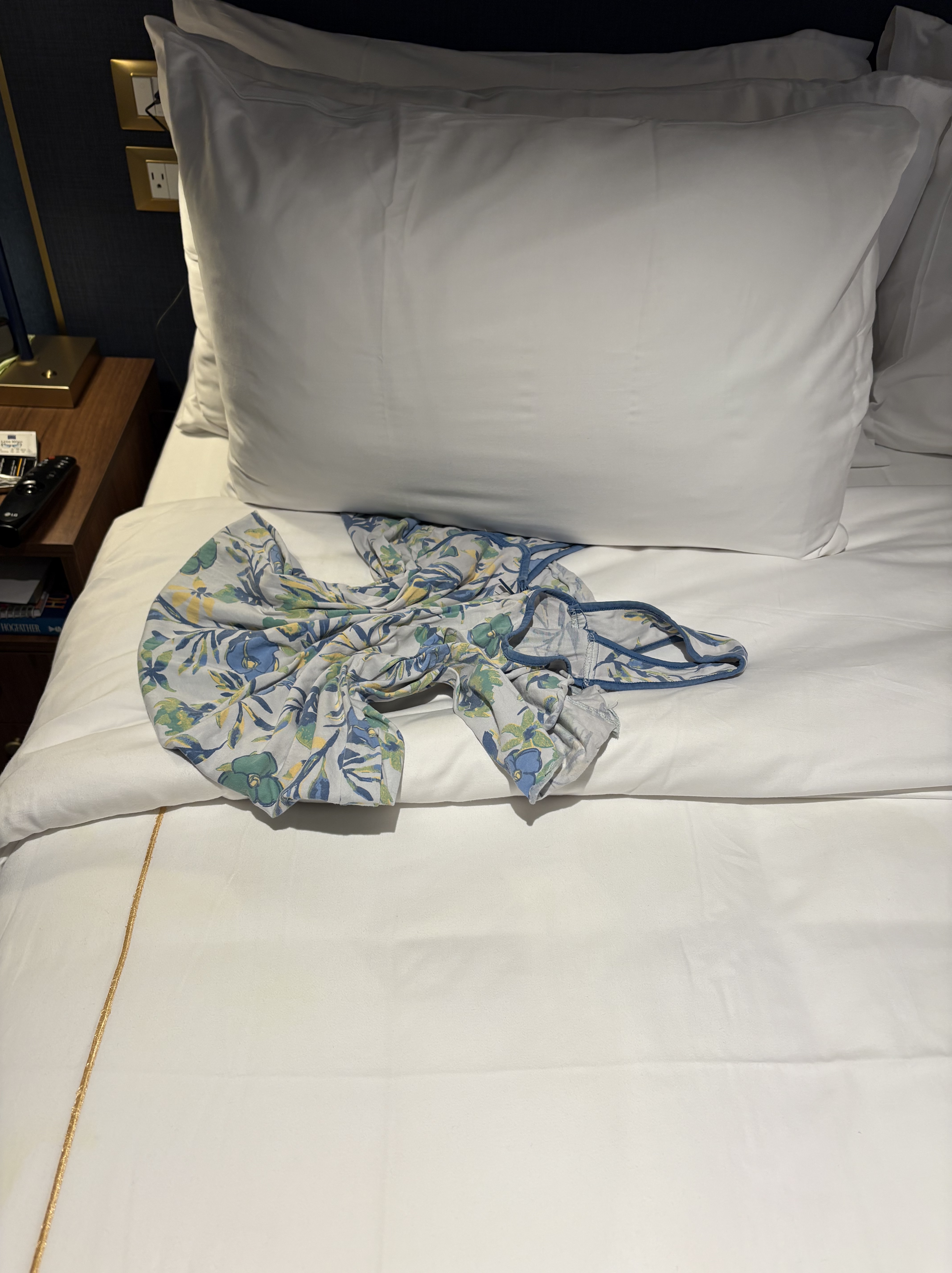 We headed in to dinner and met our waiting staff (Anthony and Kudza) and our sommelier (Harry). They would prove to be spectacularly good in terms of anticipating our needs, and in the case of Harry, recommending some great wines. The only fault I could find with the food was that the cheese trolley contains cheese aimed at people who are afraid of cheese! Other than that, the food was excellent and the service was just right. We opted to get a sensibly early night, and were delighted to return to our room to see that in addition to leaving us our chocolates, and the following day’s Daily Programme, Jerick, our steward, had formed various items of nightwear into new and interesting shapes!
