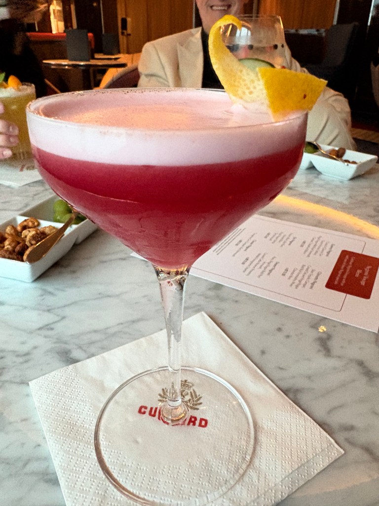 We took it in turns to sit out on the large balcony and watch the world go by until we’d finished packing, showered and changed, and it was time for pre-dinner drinks in the Chart Room. There is low level music in there, and a lovely cocktail list offering drinks based on zodiacal signs. The irony of that is that both mine and Lynne’s signs offered a gin-based concoction and we both hate gin. By the end of the trip, we had worked our way through 10 of the 12 cocktails, and thoroughly enjoyed all of them. We still hadn’t touched the gin ones though!
