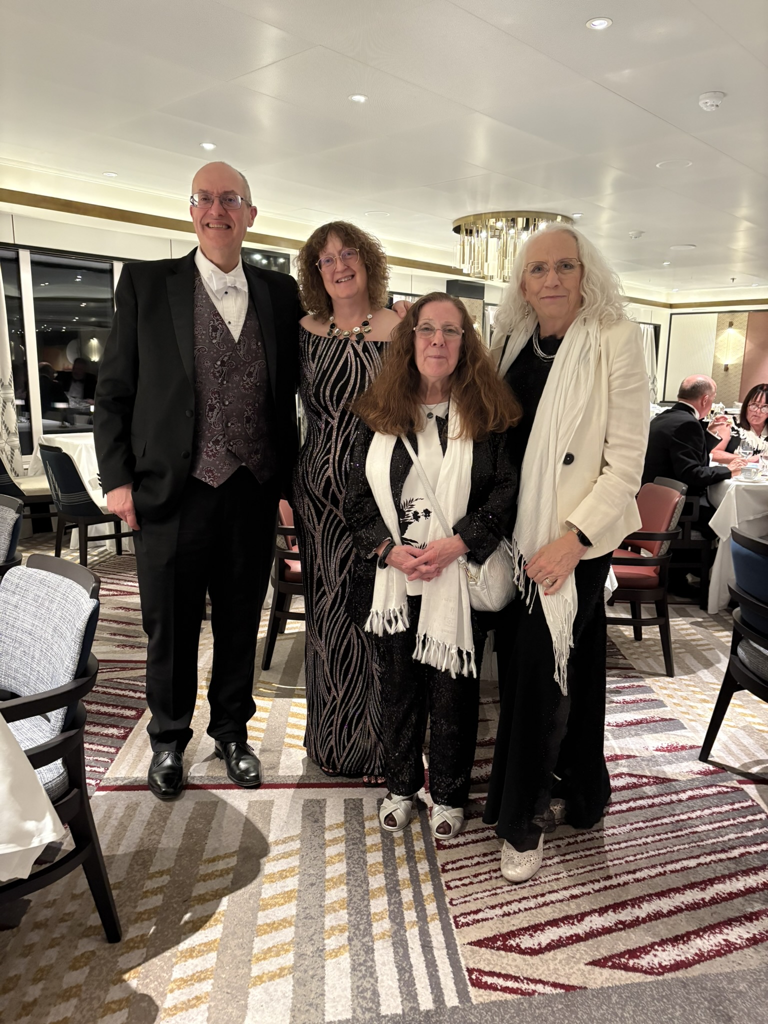 Day 3 was much the same but came with the first gala evening, one of the things we liked so much about our previous much shorter “taster” cruise to Hamburg in 2023. Cunard are relatively strict about these things, and say: “From 6pm onwards, a smart attire dress code applies in most bars, restaurants, and entertainment venues. This typically includes for women cocktail dresses, skirts or tailored trousers with an elegant top. For men: collared shirts with trousers; jackets are optional but encouraged. On Gala Evenings, a more formal dress code is observed in these same venues. Guests are invited to embrace the occasion with for women: floor-length gowns, cocktail dresses, or smart trouser suits, and for men: dinner jackets, tuxedos, or dark suits with a tie or bow tie. Not permitted: jeans or casual wear.”