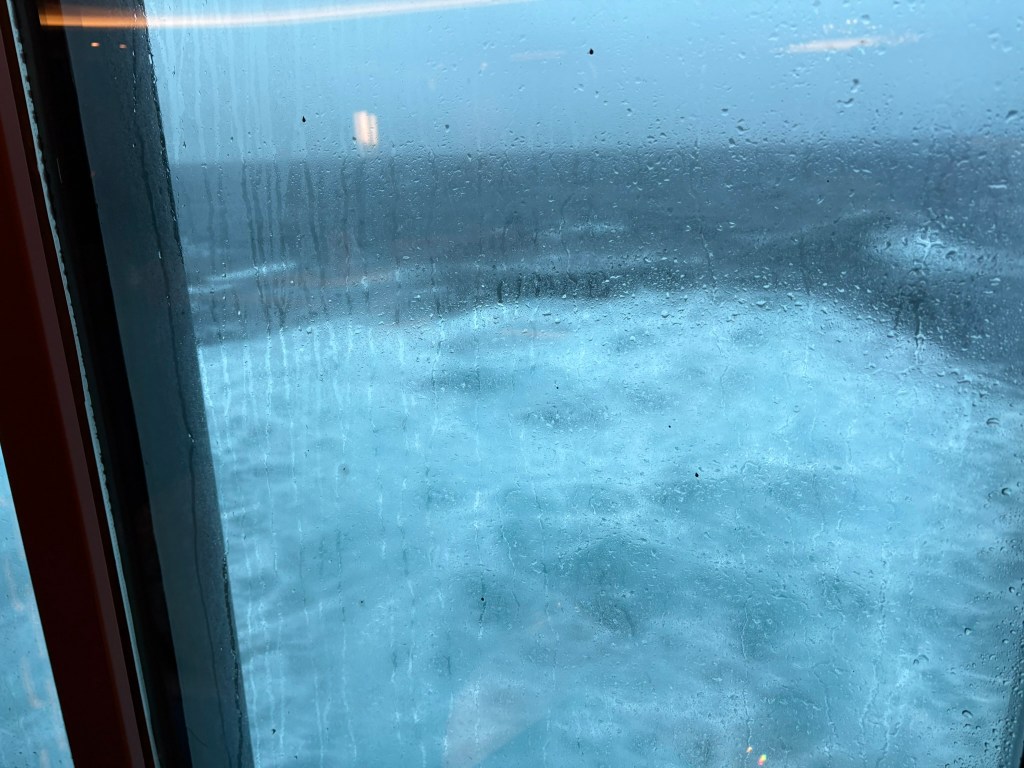 Later we met up with J and J for pre-dinner drinks, and watched the waves pounding the windows in the Chart Room. It was getting ever more difficult to walk in a straight line on board, although the motion was not an issue in any other way. No one felt seasick, just unable to walk straight ahead. It was no surprise to note that the Promenade Deck was now closed. Just as well I’d got my run in early on.