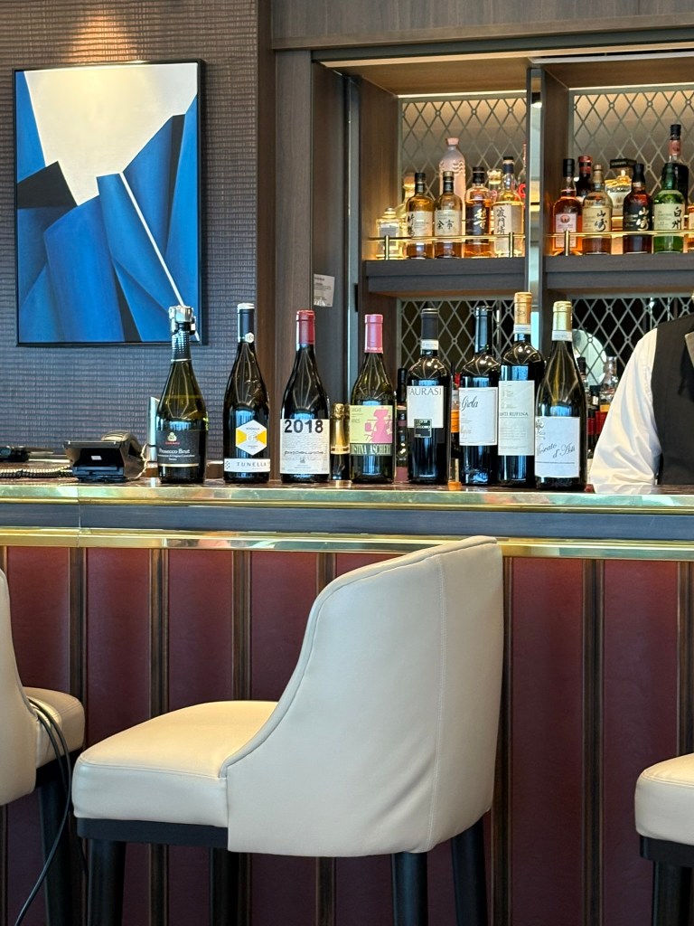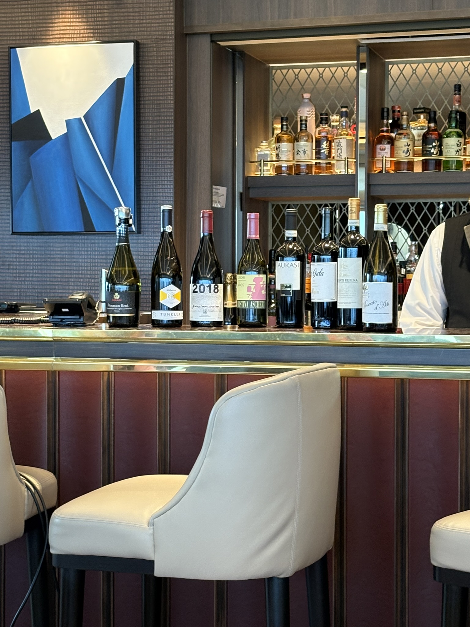 The following day dawned a lot calmer and I was able to get out and run before breakfast. We then took a very light breakfast because Lynne and I were booked in to Sir Samuel’s for a “Lunch and Learn” session with the head sommelier, Dickson Moniz. This we now knew would entail five courses of Italian food with several matching Italian wines. Anything more than Bircher muesli and toast would be very foolish and possibly counterproductive.