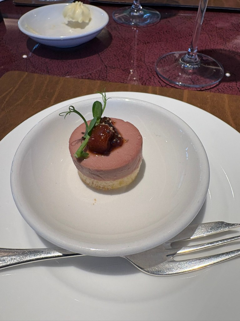 Once everyone was seated, we were given an amuse bouche of duck liver pate to go with a glass of Prosecco, Cunard Cellar Reserve. We had already gone through several bottles of this already, but another measure wouldn’t hurt! The head sommelier and his fellow sommeliers talked us through each wine pairing, and were knowledegable and a lot of fun too.